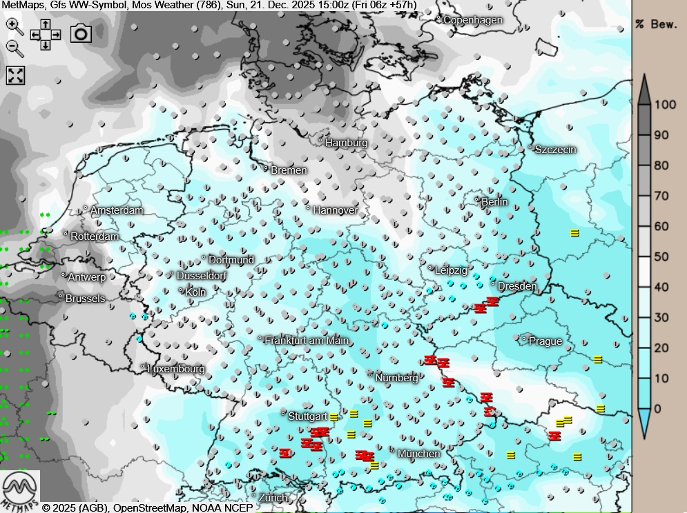 Am Sonntagnachmittag zeigt sich der Himmel über weiten Landesteilen wechselnd oder stark bewölkt, lokal ist es auch längere Zeit neblig-trüb. Größere Auflockerungen beschränken sich vor allem auf die Höhen der Mittelgebirge und den Alpenrand. Es bleibt niederschlagsfrei.