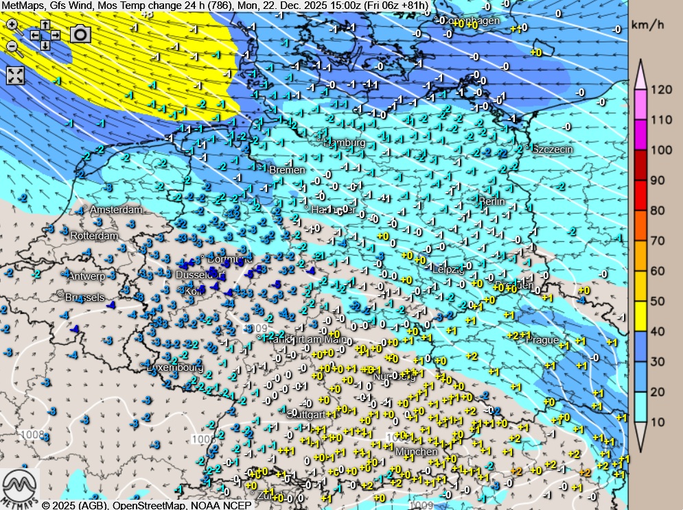 Die Temperaturen erreichen im Südosten Werte um 2 Grad, sonst werden Höchstwerte um 5 Grad im Nordosten und 12 Grad am Niederrhein erreicht.