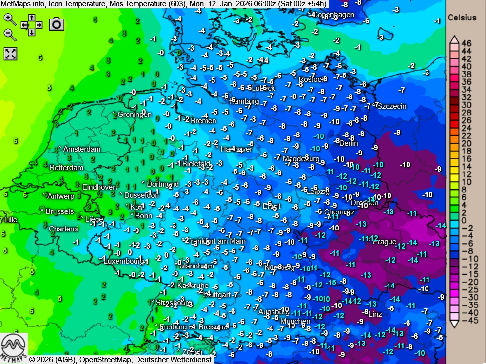 Die Wetterkarte für Montagfrüh mit Schnee (blau) und gefrierendem Regen (rot) sowie die Temperaturkarte für 06:00 Uhr nach ICON: