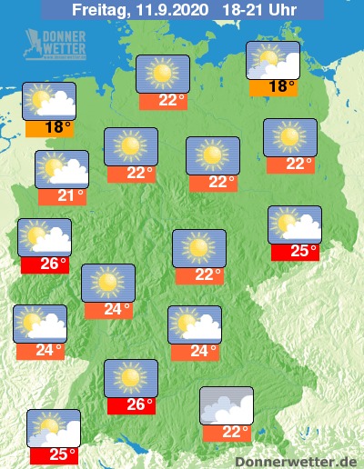 Am frühen Abend liegen die Temperaturen zwischen 18 Grad an den Küsten und spätsommerlichen 26 Grad an Rhein, Mosel und Neckar.