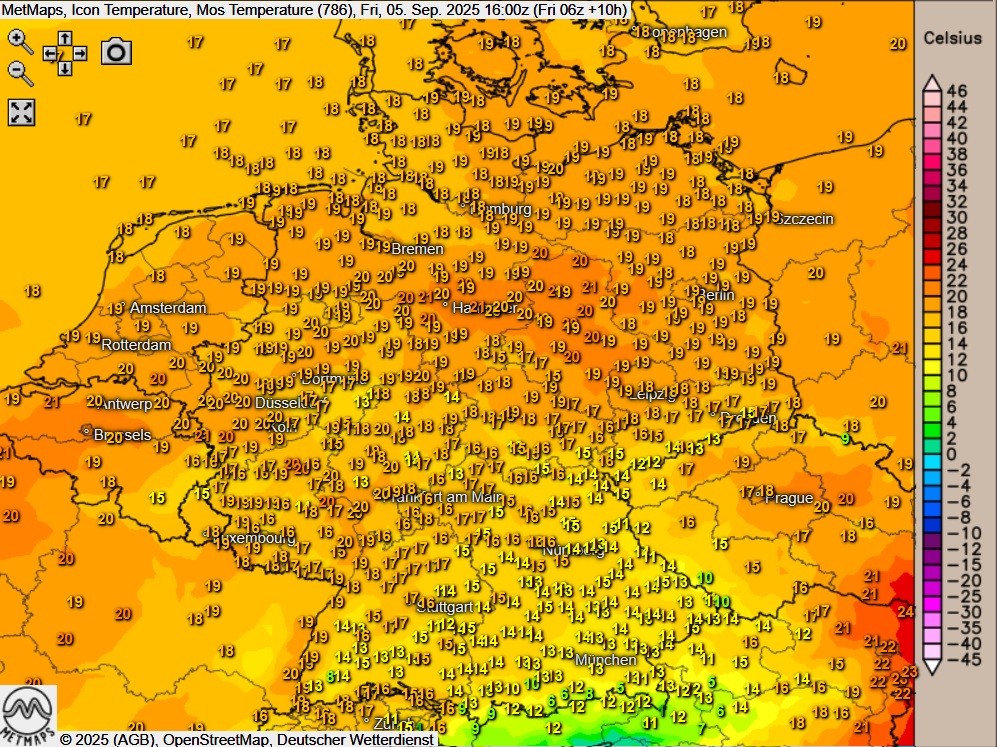 Die Lufttemperaturen am Freitagnachmittag (16:00 Uhr) sowie die Sechs-Stunden-Regenmengen bis 21:00 Uhr nach ICON / ICON-RUC: