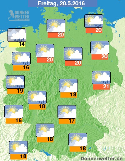 Die Temperaturen erreichen eher noch verhaltene 14 Grad C in Ostfriesland und um 21 Grad C in Dresden.