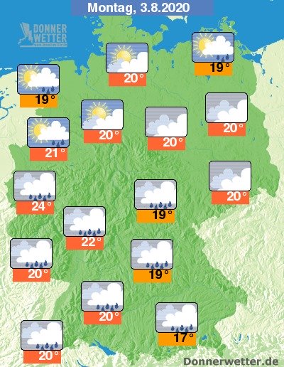 Am Montag halten sich über der Südhälfte und den westlichen Landesteilen meist dichte Wolken und es bilden sich zeitweise Schauer. Im übrigen Bundesgebiet ist es teils stark, teils aufgelockert bewölkt, dabei bleibt es zumeist trocken. Die Temperatur liegt nur noch bei 17 Grad in Rosenheim und bis 24 Grad in der Kölner Bucht.