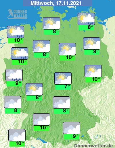 Heute ist es überwiegend stark bewölkt oder neblig-trüb, hier und da zeigen sich aber auch Auflockerungen, jedoch ist ebenso etwas Regen möglich. An den Küsten bilden sich zudem einzelne Schauer. Die Temperatur erreicht 7 Grad in Erfurt und bis 10 Grad in Stuttgart. An den Küsten weht ein oft stürmischer Wind.