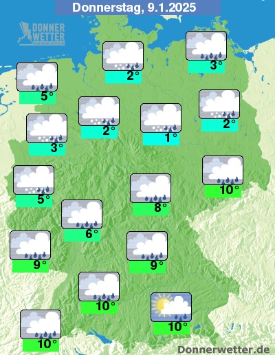 Die Temperaturen erreichen am Donnerstag Werte um 1 Grad im Norden Brandenburgs und 10 Grad im Süden Baden-Württembergs.