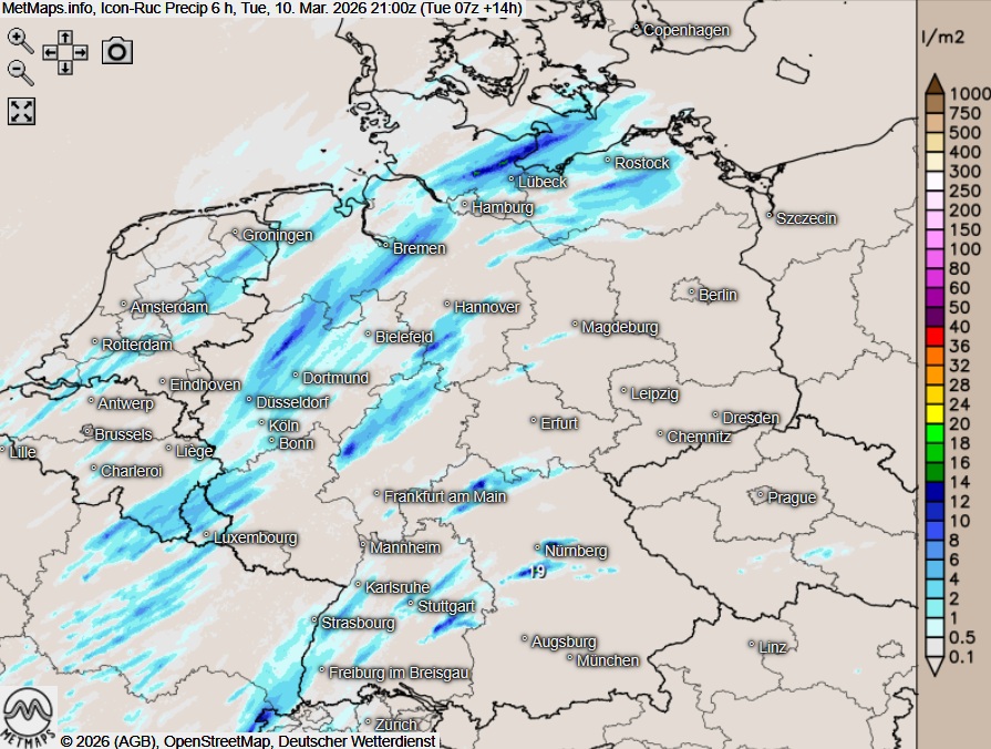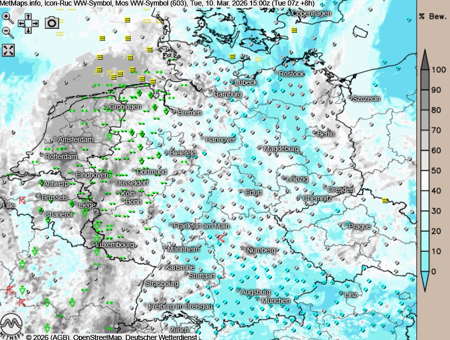 Die Wetter- und Temperaturkarte für 15:00 Uhr sowie die 6-Stunden-Regenmengen bis 21:00 Uhr nach ICON-RUC: