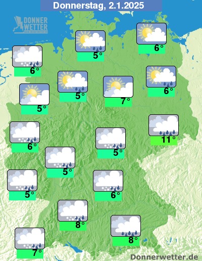 Heute bleibt es über der Südhälfte Deutschlands bedeckt, dabei fällt oft Schnee, Schneeregen oder Regen. Im Norden ist es dagegen auch oft aufgelockert, teils dicht bewölkt, hier bilden sich mögliche Schnee- oder Regenschauer. Die Höchstwerte erreichen 5 Grad im Saargau und bis 11 Grad in der Lausitz. An der See und im Süden des Landes ist es weiterhin oft stürmisch.