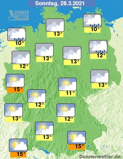 Am Sonntag zeigt sich das Wetter im Süden und Westen oft heiter, vor allem im Norden und Osten ziehen dagegen oft dichte Wolken durch, dabei fällt im Norden und Nordosten gebietsweise Regen, im übrigen Land bleibt es aber trocken. Die Temperatur steigt auf 10 Grad an den Küsten und bis 15 Grad im Breisgau. An der Nordsee weht ein verbreitet stürmischer Wind.