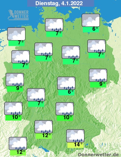 Heute ziehen weitgehend dichte Wolken durch, im Norden sind Auflockerungen jedoch möglich. Vor allem über der Südhälfte fällt häufig, sonst gebietsweise Regen. Die Temperatur erreicht 6 Grad in Neubrandenburg und bis 14 Grad in München. Im Süden ist es zudem verbreitet stürmisch.