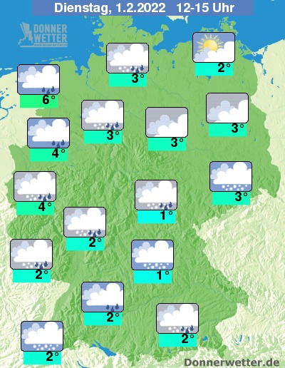 Heute Nachmittag ziehen dichte Wolken durch, dabei fällt über der Süden und Osten häufig Schnee oder Schneeregen, sonst überwiegend Regen. Die Temperatur liegt bei 1 Grad in Mittelfranken und bis 6 Grad im nördlichen Emsland, Vor allem über dem Norden weht zudem ein oft stürmischer Wind, an der See herrscht zum Teil Sturm.