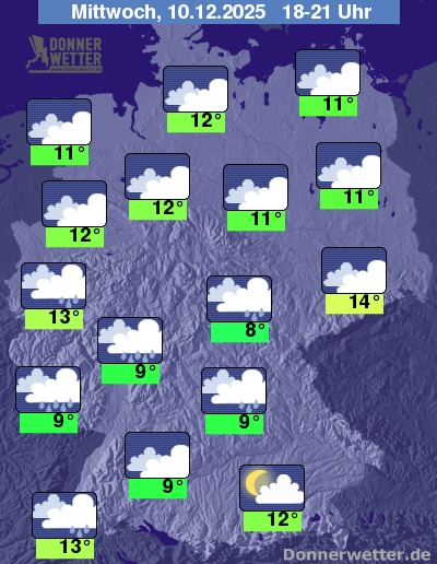 In der Nacht zum Donnerstag zieht der Regen nach Südosten hin ab und auch über der Südosthälfte klingt der Regen bis zum Morgen nach und nach ab. Über der Nordwesthälfte ist es oft stark, gebietsweise aber auch aufgelockert bewölkt, dazu bleibt es trocken. Die Temperatur sinkt auf 11 Grad in Dresden und bis etwa 6 Grad in Augsburg.