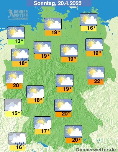 Am Ostersonntag kann sich zwischen lockeren bis noch aufgelockert Wolken häufiger die Sonne zeigen. Im Westen und Südwesten und im Verlauf auch über der übrigen breiten Landesmitte können sich allerdings einzelne Schauer und Gewitter bilden, sonst bleibt es meist niederschlagsfrei. Die Höchstwerte erreichen 13 Grad an der Nordsee und bis 22 Grad in der Niederlausitz.