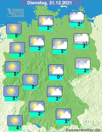 Heute ist es über der Westhälfte der Republik verbreitet heiter bis sonnig. Im übrigen Land ist es oft trüb, Aufheiterungen sind dennoch möglich. Im Osten und Nordosten sind hier und da einige Flocken oder Tropfen möglich, sonst bleibt es aber trocken. Die Temperatur steigt auf 0 Grad im Thüringer Becken und bis 5 Grad im Rheinland.