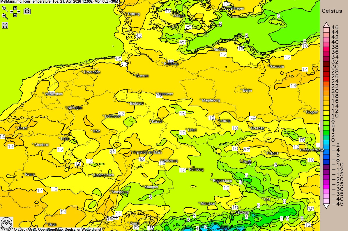 Die Temperaturen erreichen dabei Höchstwerte zwischen 11 und 16 Grad. Ein schwacher bis mäßiger Nordostwind bestimmt das Strömungsgeschehen und lässt die Luft deutlich frischer wirken, als es die Strahlungskurve der Aprilsonne vermuten ließe.