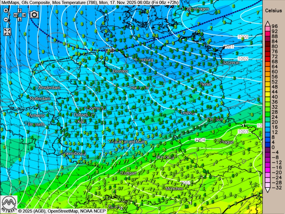 Die Strömungs- / Temperaturkarte für Montagfrüh sowie die 24-Stunden-Regenmengen am Montag nach GFS: