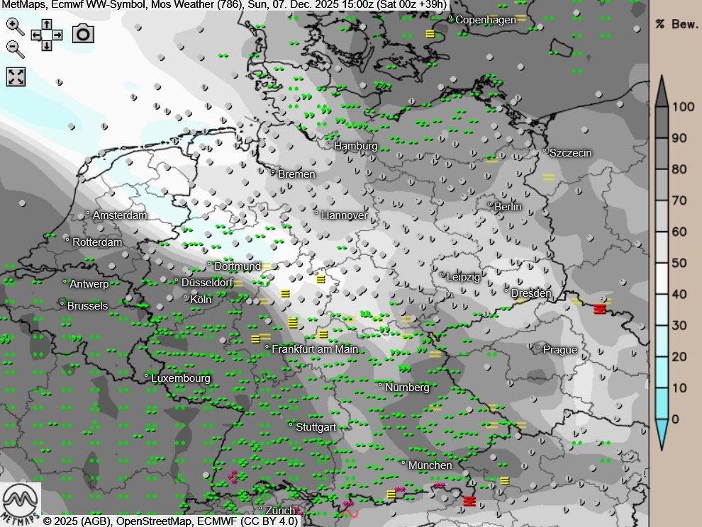Am Montagnachmittag zeigt sich der Himmel über weiten Landesteilen stark bewölkt, einzelne Auflockerungen beschränken sich überwiegend auf die Osthälfte. Von Westen und Nordwesten fällt dabei Regen, in der Südhälfte bleibt es meist niederschlagsfrei.