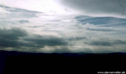Zwei Wolkentypen in verschiedenen Höhen scheinen herein zu ziehen. Hohe Wolken der Cirrus spicatus und eine Cirrustratuswolken-Familie liegen viel höher als die Stratucumuluswolken in der unteren Troposphäre. Für mich sieht es hier nach einem Tiefdruckgebiet aus. Ich denke, dass ein Tief auf den Beobachter zieht, welches in der Nacht Regen bringen wird.