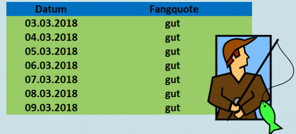 Wir befinden uns dann kurz nach einer Vollmondphase, welche bekanntermaßen das Fressverhalten des Fangs steigert; zudem kündigt sich in der neuen Woche nicht nur insgesamt milderes, sondern auch deutlich wechselhafteres Wetter an. Der höhere Bewölkungsgrad und leichte Niederschläge geben der Fangquote dann nochmals einen "Push".