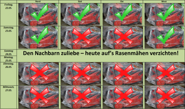 Vor allem der heutige Freitag bietet sich dazu an, dem heimischen Rasen noch einen schicken Pfingstschnitt zu verpassen. Im Norden und Westen kann weitgehend trockenes Wetter auch noch am Samstag für die angefallene Gartenarbeit genutzt werden.