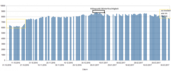 Die Grafik zeigt die Aufzeichnungen unseres Lysimeters (Messgerät zur Erfassung des Wasserhaushalts in Böden) im Zeitraum 01.10.2016 bis 30.03.2017. Gut zu erkennen: Die im Boden enthaltene Feuchtigkeit der letzten Wochen liegt nur geringfügig über den Werten aus dem Herbst. Der Herbst 2016 schnitt deutschlandweit als zu sonnig und warm und extrem trocken ab.