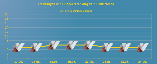 Vor allem die Gefahr sommerlicher Halsentzündungen ist aktuell gegeben. In dieser Woche liegt die Zahl der an einer Erkältung oder Grippe erkrankten Deutschen durchschnittlich bei sechs Prozent.