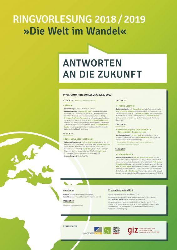 Die Reihe „Die Welt im Wandel“ wird durchgeführt vom Forum Internationale Wissenschaft der Universität Bonn, dem Liaison-Office Internationale Wissenschaft der Stadt Bonn und der Deutschen Gesellschaft für internationale Zusammenarbeit (GIZ) GmbH.