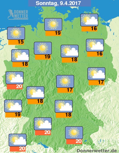 Zu Wochenstart (03.04.) blieb es von Niedersachsen bis zur polnischen Grenze meist den ganzen Tag trüb; im Süden bildeten sich im Tagesverlauf örtliche Schauer und Gewitter. Sonst schien für längere Zeit die Sonne. Die Höchsttemperaturen erreichten 10 Grad C unter den dichten Wolken. Im Südwesten kletterte das Thermometer mit sonniger Unterstützung allerdings auf warme 20 Grad C.