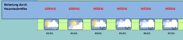 Mit steigenden Temperaturen und höherem Schauerrisiko in der neuen Woche steigt das Hausstaubrisiko aber wieder an.