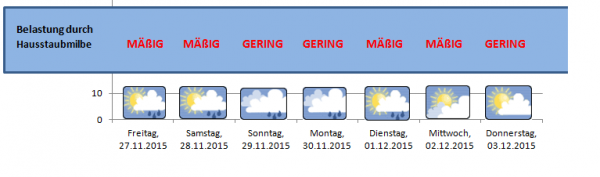In den kommenden Tagen bestimmen tagsüber wieder mildere Temperaturen unser Wettergeschehen; die insgesamt mäßig hohe Außenluftfeuchtigkeit sorgt auch beim Hausstaub für maximal mäßige Belastungen.