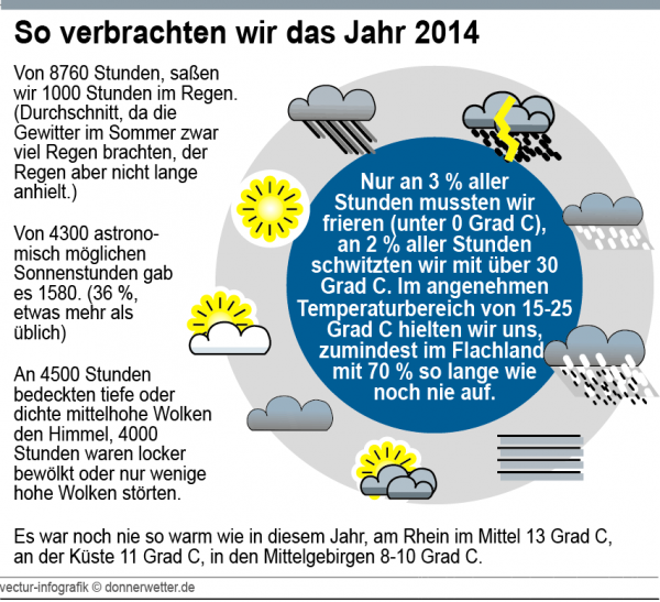 Von den 8.760 Stunden, die das Jahr 2014 umfasste, saßen wir 1.000 Stunden im Regen. Dies liegt ziemlich im Durchschnitt, auch wenn die vielen Gewitter im Sommer zwar sehr viel Regen brachten, aber auch schnell wieder abgezogen waren.