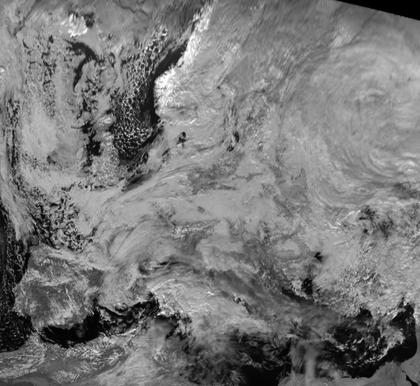 Auch heute zeigt sich Europa auf dem Satellitenbild zu großen Teilen unter dichten Wolken. Zwischen Hoch 'Frommhold' mit Zentrum über dem Europäischen Nordmeer und Tief 'Petra' über Südschweden strömt kalte Polarluft nach Süden, was gut an der zellulären Bewölkung erkennbar ist. Über den westlichen Mittelmeer befindet sich Tief 'Queen', über dem schwarzen Meer Tief 'Olga'.