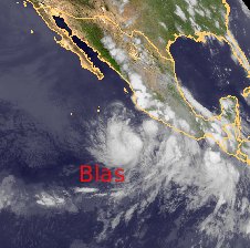 Über Mexiko erkennt man einige sommerliche Gewitterzellen, vor allem an den Gebirgen im Westen. Nach Nordwesten hin findet man jedoch keine Wolken mehr. Auch auf dem Pazifik kommt es zu tropischen Regenfällen und Gewittern. Etwas westlich von der Küste hat sich dabei auch der Tropensturm 'Blas' entwickelt. Derzeit erreicht er aber nur Böen bis 75 km/h.