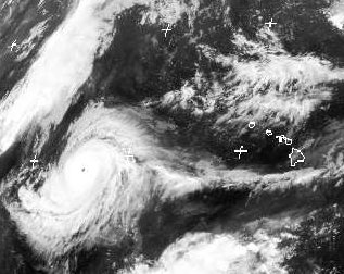 Auch südwestlich der Hawaii-Inseln liegt jetzt ein ausgeprägter Hurrikan. Er erreicht im Mittel Windgeschwindigkeiten bei 255 km/h und in Böen bis 290 km/h. Eine Gefahr für bewohnte Inseln stellt er durch seine Lage allerdings nicht da. (Bildquelle: NERC Satellite Receiving Station, Dundee University, Scotland, http://www.sat.dundee.ac.uk/)