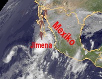 Auf dem heutigen Satellitenbild von Mittelamerika zeigt sich Hurrikan 'Jimena' direkt vor der Westküste Mexikos. Er weist derzeit seine voraussichtlich höchsten mittleren Windgeschwindigkeiten von 250 km/h auf, womit er die höchste Stufe 5 der Hurrikanskala erreicht hat. In einigen Küstenbereichen Mexikos kann es zu erheblichen Niederschlägen kommen. Auf seinen weiteren Weg nach Norden über die Halbinsel Niederkalifornien, schwächt sich der Wirbelsturm voraussichtlich zunächst langsam und ab morgen spürbar ab.