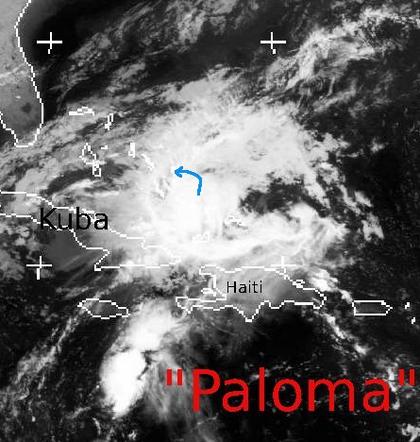 Hurrikan 'Paloma' über dem östlichen Kuba hat sich seit gestern von einem Kategorie-4 auf einen Kategorie-1-Hurrikan abgeschwächt und erreicht noch Windgeschwindigkeiten von etwa 140 km/h. Grund für die Abschwächung sind zum Einen der Landgang über Kuba und zum Anderen das kühlere Wasser im nördlicheren Atlantik, das den Wirbelsturm nicht mehr ausreichend mit Energie versorgen kann. 'Paloma' zieht nur sehr langsam etwas nach Nordwesten und wird sich weiter abschwächen, allerdings kann es noch sehr stark regnen. (Bildquelle: Copyrigt EUMETSAT, NERC Satellite Receiving Station, University of Dundee)