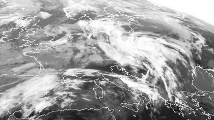 Zwei Tiefdruckgebiete 'Bruno' und 'Arfst' sorgen für wechselhaftes Wetter in weiten Teilen Mitteleuropas. Auf dem Satellitenbild vom Mittwochmorgen ist sehr gut die Warmfront zu erkennen, die sich von Polen bis zum Balkan erstreckt. Weiter westlich halten sich Haufenwolken, die von Polen bis nach Weißrussland kräftige und gewittrige Schauer bringen. Wolkenreich bleibt es auch in Westeuropa, im Laufe des Tages entwickeln sich hier Schauer und Gewitter.