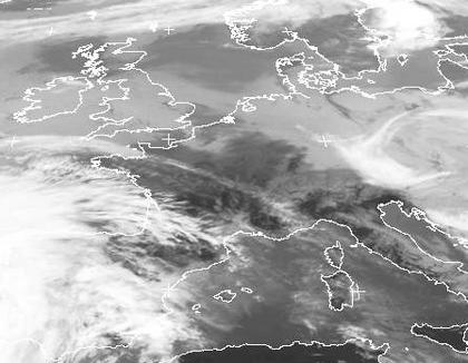 Hoch 'Ingo' sorgt weiter für niederschlagsarmes Wetter von den Britschen Inseln bis zur Ostsee. Man erkennt aber eine Schicht tieferer Bewölkung über Deutschland. Nur über Bayern zieht auch höhere Bewölkung westwärts. Dort fällt etwas Schnee, sonst ist es meist nur Schneegriesel. Unterdessen zieht ein Tief mit mehr Wolken und Regen vom Atlantik auf die Iberische Halbinsel, wo es zu Regen kommt.