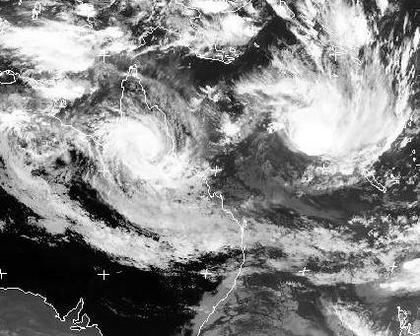 Der schwere Zyklon 'Larry' der am Montag noch mit bis zu 225 km/h Windgeschwindigkeit über Nordaustralien tobt, hat einen Nachfolger bekommen: Der neue Wirbelsturm 'Wati' bei Neukaledonien, auf dem Bild als Wolkenklumpen weiter rechts zu erkennen, soll sich in den nächsten Tagen zum Zyklon verstärken. Auf seiner Zugbahn nach Osten kann auch er Australien erreichen.