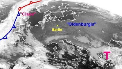 Über dem östlichen Mittelmeer sowie auf dem Balkanhalbinsel halten sich gebietsweise noch Haufenwolken eines alten Höhentiefs, das sich immer weiter auflöst. Ein Wolkenband mit teils kräftigen Niederschlägen erstreckt sich von der norwegischen Westküste über die Britischen Inseln bis nach Nordspanien, er gehört dem neuen Tief 'Claus' nördlich von Schottland. In weiten Teilen Ost- und Mitteleuropas sowie in Skandinavien sorgt ein stabiles Hoch mit dem Namen 'Oldenburgia' mit Zentrum über Westrussland für ruhiges, teils trübes, meist aber sonniges Wetter; einige Hochnebelfelder sind an der Südseite der Alpen zu erkennen.