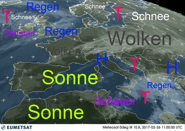 Das Satellitenfoto von heute Mittag zeigt uns die ungefähre Wetterverteilung in Europa. Die Sonne scheint von Spanien bis Italien und über Nordafrika. Im zentralen und östlichen Mittelmeerraum sorgt ein Tief für Regen und Schauer. In Skandinavien und Russland fällt gebietsweise Schnee.