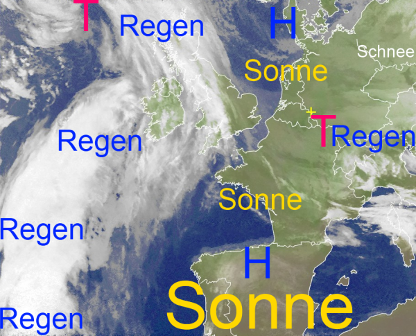 Das kleine Tief über Nordostfrankreich zieht mit seinen Regenwolken ab. Anschließend baut sich eine umfangreiche Hochdruckzone auf, die ein Vordringen weiterer Störungsgebiete vom Atlantik verhindert und uns einen ruhigen Jahresausklang bescheren wird. Dabei gibt es eine Mischung aus Sonne, tiefhängenden Wolken oder auch Nebel.
