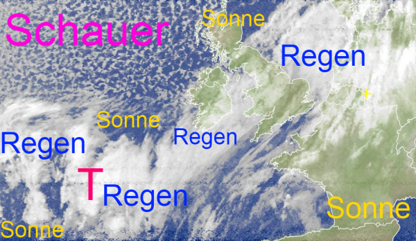Die wabenförmigen Wolken über dem nördlichen Atlantik kennzeichnen Schauer, die sich in der kälteren Luft gebildet haben. Dazwischen findet man auch sonnige Aufheiterungen.