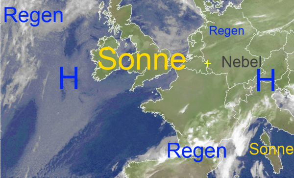 Über Mitteleuropa haben sich in der windschwachen Luft über Nacht vermehrt Nebelfelder gebildet oder verdichtet, die es der Sonne trotz Hochdruckeinflusses schwer machen sich in Szene zu setzen. Außerdem hat sich über Norddeutschland das Wolkenband einer schwachen skandinavischen Kaltfront ausgebreitet, aus der es stellenweise tröpfelt, im Vorfeld der Front auch nieselt. Achtung, auf gefrorenem Boden kann es dabei auch glatt werden.