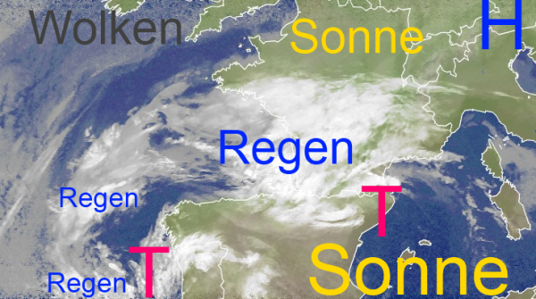 Während bei uns dank der Hochdruckzone immer noch ruhiges, aber häufig neblig-trübes Wetter herrscht, halten sich über Südwesteuropa immer noch die Reste des Unwettertiefs mit Regenwolken. Sonst gibt es vor allem über Spanien und dem westlichen Mittelmeer auch wieder große sonnige Gebiete.