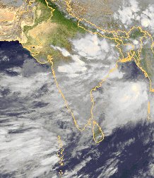 In Indien hat der Sommermonsun eingesetzt. Durch die Erwärmung der Subkontinents strömt dabei feuchte Luft vom Indischen Ozean über das Land. Man erkennt auf dem Satellitenbild die Bewölkung ausgedehnter tropischer Gewitter- und Regengebiete. Den Nordwesten des Landes haben die Wolken jedoch nicht erreicht.