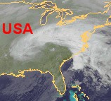 Auf dem Satellitenbildausschnitt von der Osthälfte der USA ist in einem breiten Streifen vom Mittleren Osten bis zur Atlantikküste ein kräftiges Tiefdrucksystem mit dichten Wolken zu erkennen. Hierbei fällt gebietsweise langandauernder Regen, im Norden teils auch Schnee. In den übrigen Gebieten ist es weitgehend freundlich und trocken.