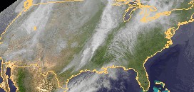 Das heutige Satellitenbild der USA zeigt häufig dichte Wolken sowohl im Nordosten der Vereinigten Staaten als auch in einem breiten Streifen von den Großen Seen südwärts bis zum Golf von Mexiko. In diesen Regionen fällt zum Teil andauernder und ergiebiger Regen. Besonders freundlich ist es dagegen entlang der Ostküste und zum überwiegenden Teil auch im Mittleren Westen der USA.