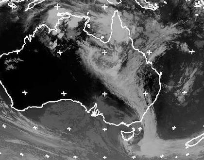 Ein Tief bei Tasmanien lenkt von Süden Kaltluft in das innere Australiens. Man erkennt gut das Wolkenband einer Kaltfront, die sich zur Ostküste hinbewegt. Sie bringt Schauer und Gewitter. Am kräftigsten sind die Gewitter in den nördlichen, tropischeren Regionen. (Bildquelle: NERC Satellite Receiving Station, Dundee University, Scotland, http://www.sat.dundee.ac.uk/)