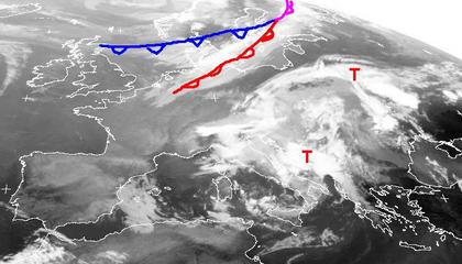 Auf dem Satellitenbild von Samstag früh sind die Fronten von Nordmeertief 'Mona' gut zu erkennen. Die Kaltfront wird morgen über Deutschland hinwegziehen und auf ihrer Rückseite wieder kühlere Meeresluft mit sich führen. Auch von Italien bis nach Russland bringen Tiefdruckgebiete viele Wolken und Schauer. Von der Iberischen Halbinsel bis ins Baltikum sorgt eine schmale Hochdruckbrücke für meist freundliches Wetter.