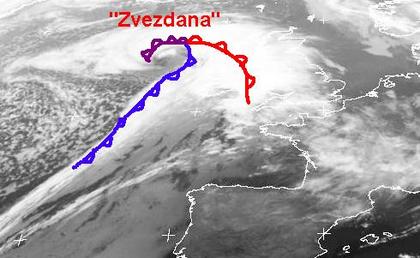 Auf dem Satellitenbild von Dienstag früh ist das Tief 'Zvezdana' mit seinen Fronten gut zu erkennen. Es bringt heute auf den Britischen Inseln Regen, und zum Teil kräftigen Wind. Auf seiner Vorderseite gelangen warme Luftmassen nach Mitteleuropa und somit auch nach Deutschland. (Bildquelle: NERC Satellite Receiving Station, Dundee University, Scotland, http://www.sat.dundee.ac.uk/)